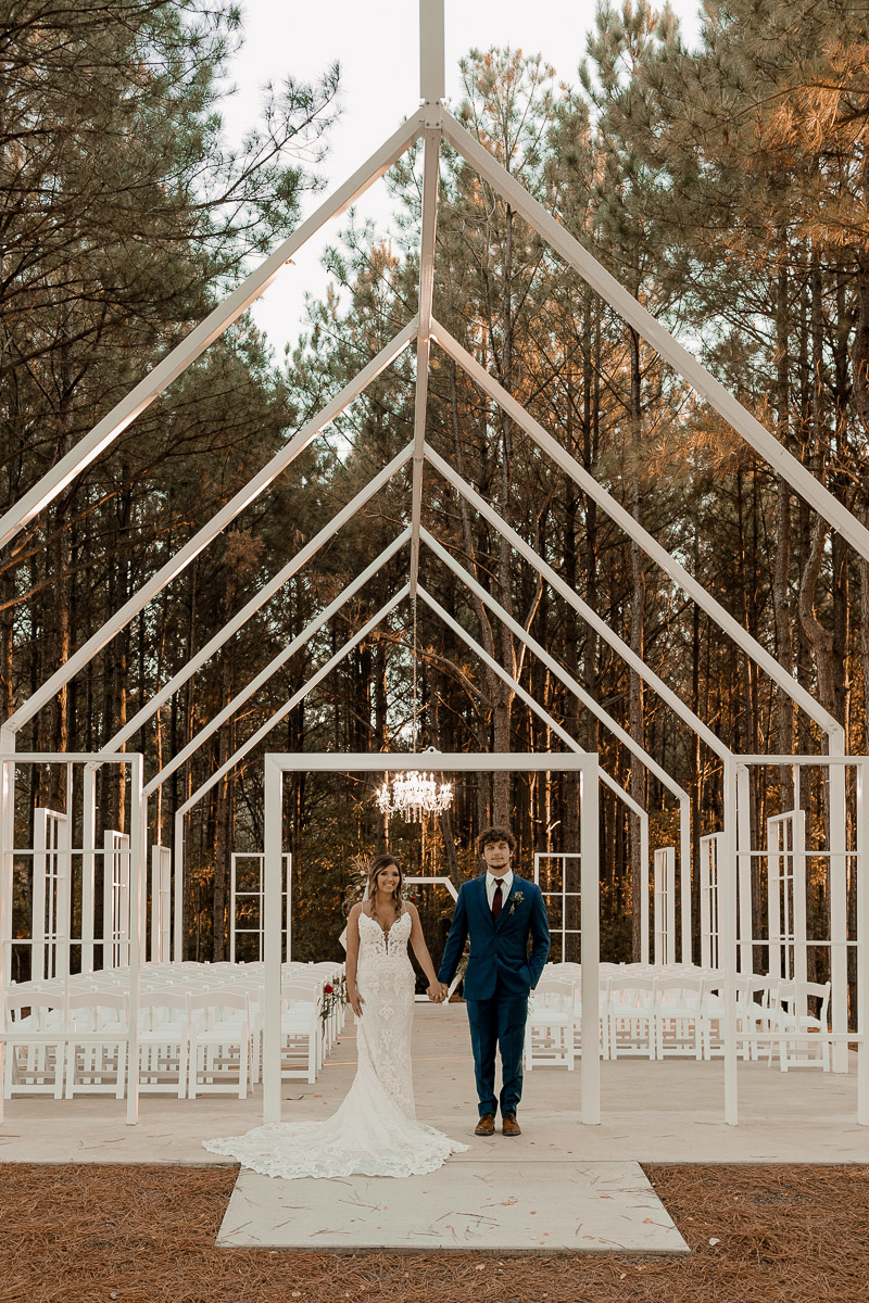 Located just outside of Batesville, Arkansas. This is a bare chapel in the woods! They have a covered outdoor reception space. This is absolutely stunning in the fall! There are bridal and groom quarters for getting ready. They fit about 130 guests! Tables and white chairs are included in your rental.